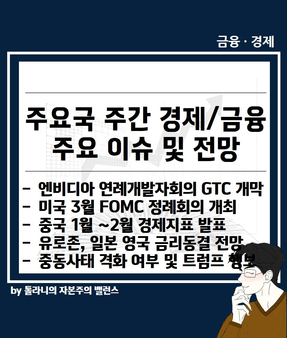중동의 지정학적 리스크가 지속되는 가운데 이번주는 엔비디아의 연례개발회의 GTC 개막, 미국 3월 FOMC 회의 등 글로벌 금융시장에 영향에 미칠 만한 이슈들의 많이 있는데요.