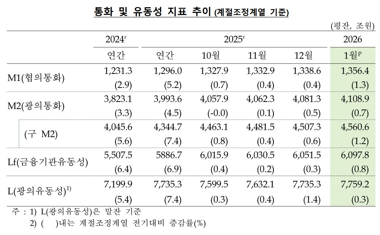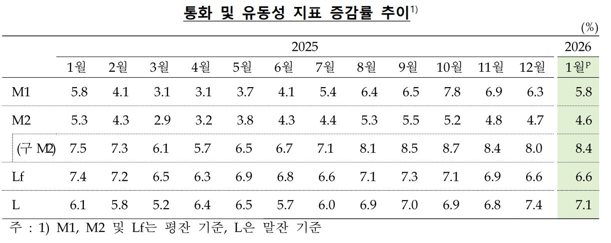 ㅇ 2026년 1월 M1(협의통화, 평잔)은 전월대비 1.3% 증가 [전년동월대비 5.8%]