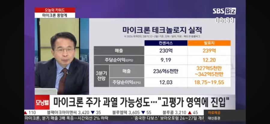 마이크론 풍향계 세계 3위 실적을 감안할때 이란 데드라인 세계영향과 사모대출 등 여러가지 영향이 섞여 있어요. 현재 실적과 주가가 엄청나게 높음 마이크론 지표 3% 떨어진 것이데 차후 지켜봐야 합니다.