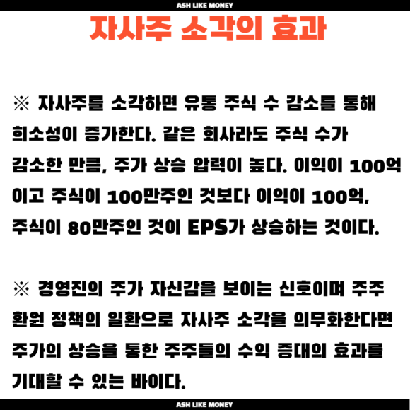 자사주 소각을 하면 유통 주식 수 감소로 희소성이 강해진다. 같은 회사 가치라도 주식 수가 감소하면 주당 가치인 EPS가 증가하고 PER 유지 시 주가 상승 압력을 받는다. 즉, 아무것도 안 해도 주가가 오르는 것이므로 저평가된 국내주식이 상승하는 것이다. 자사주 소각은 주주에게 환원하는 배당과 유사한 방식으로 기업이 주식 수를 소각한다는 것은 우리 회사를 더욱 가치를 높이니 투자자에게 신뢰를 주는 것이다. 또한, 1주당 배당금이 증가하는 효과가 있지만 기업 성장 투자 감소로 미래 투자 기회를 놓칠 수 있다.