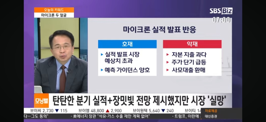 마이크론 두 얼굴 왜 떨어지는가? 실적이 세배이상 올랐는데요. 자본지출이 많음 인공지능 수요 메모리가격 떨어지는 것도 있고, 가파른 주가 상승애 따라서 이미 반영되었다고 판단하는 것이죠