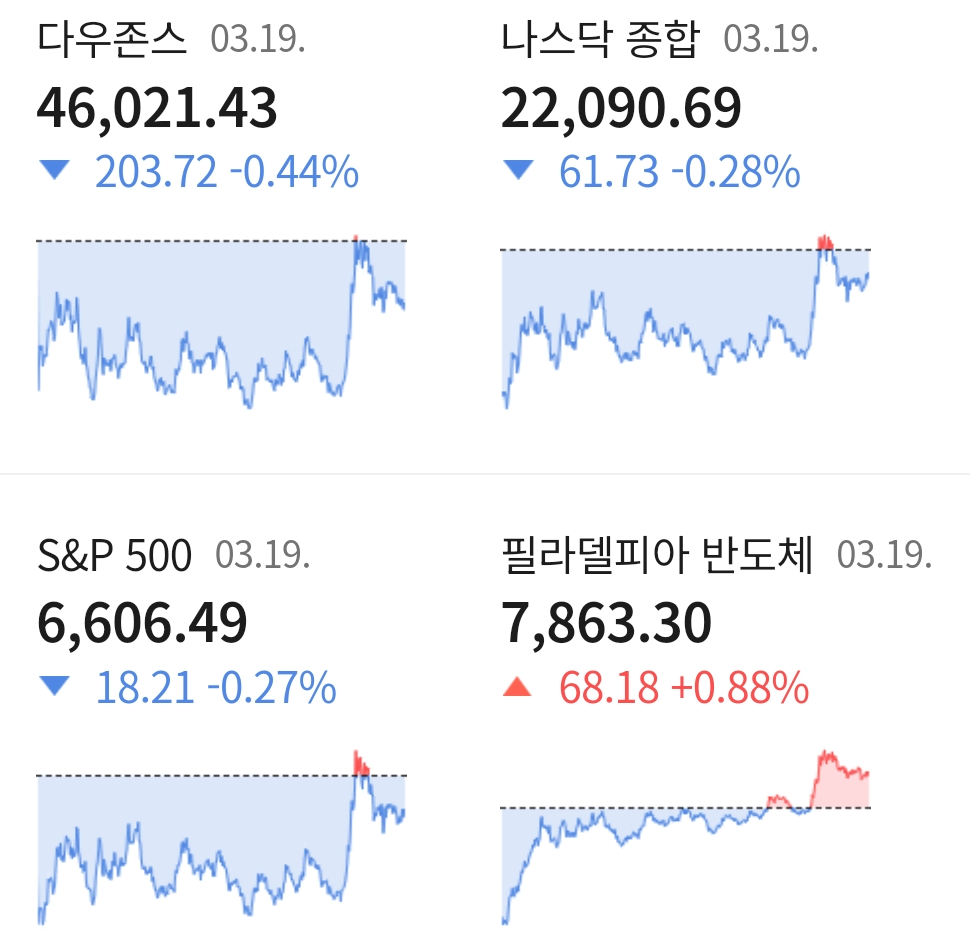 현지 시간 19일 미국 뉴욕 증시는 3대 지수 모두 하락 마감하였습니다. 중동 전쟁의 장기화로 인한 국제유가의 불확실성, 연준의 금리 동결 장기화 까지 투자 시장에 대한 불안이 커지고 있는 상황에서 투자 심리가 악화 되고 있는 상황입니다.