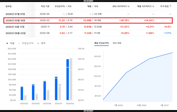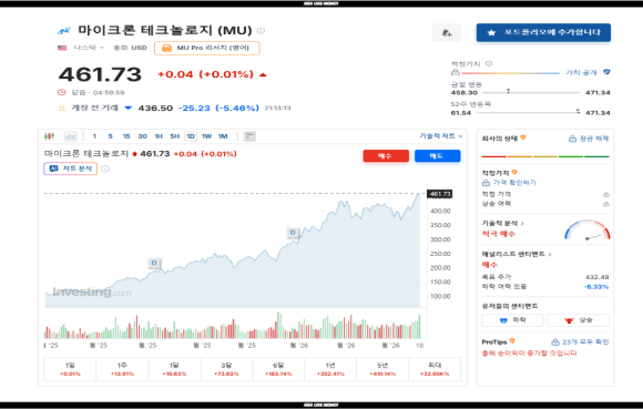 마이크론은 26년 3월 18일 실적을 발표했다. 전년 대비 동기 매출이 3배 이상 급증하며 시장 전망치를 크게 뛰어넘었다. 25년 12월~26년 2월까지의 기록을 보면 매출 238억 6,000만 달러이고 영업이익은 161억 3,500억 달러로 전년 대비 동기 매출은 196%, 영업이익은 810% 불어나 역대 최고의 실적을 발표했다. 마이크론은 1978년 처음 창립한 이래로 2010년 초반까지 이어졌던 불안정한 DRAM 사업 시장환경을 이겨내고 삼성전자, SK하이닉스와 더불어 빅3로 남아 작년부터 엄청나게 올랐다.