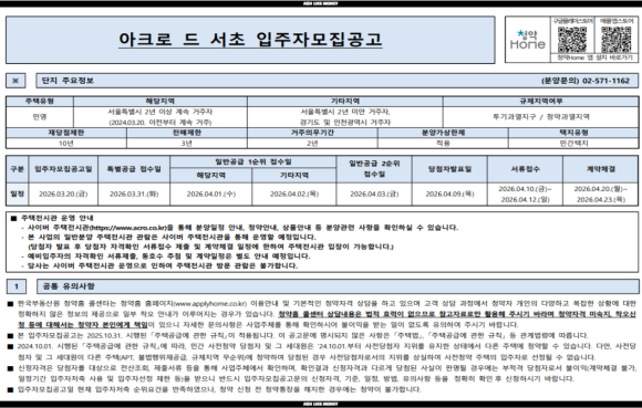 서울특별시 거주자 및 수도권 지역에 거주하는 사람이 청약신청할 수 있고 경쟁 발생시 서울시 2년 이상 거주자에게 우선공급한다. 청약통장에 가입하여 2년이 지난 자로서 예치기준금액을 납입한 세대주, 과거 5년 이내 당첨된 자의 세대에 속하지 않고 2주택 이상이면 안된다. 투기과열지구 + 분양가상한제 지역이라 전매제한 3년, 재당첨제한 2년, 실거주 의무 2년이 붙는다. 아크로 드 서초는 중도금 대출이 40%, 이자는 직접 납부하는 형태로 후불식이자가 아니므로 주의한다.