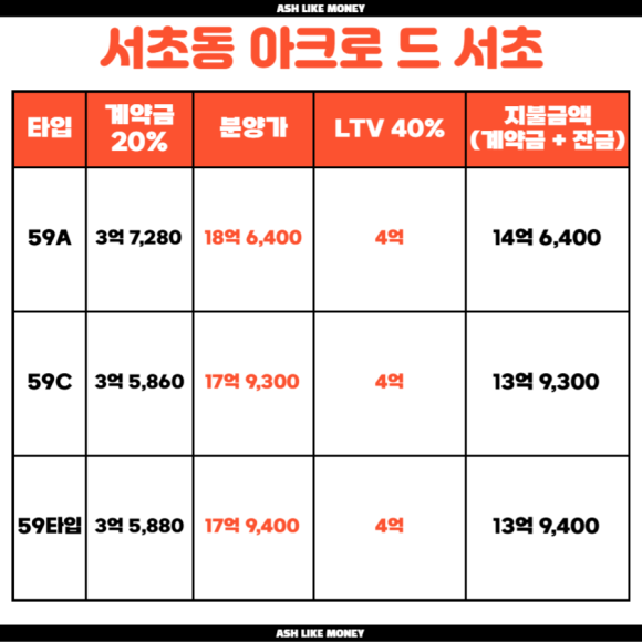 아크로 드 서초는 계약금이 20%이므로 기본 계약금이 3억 7천 이상이고 투기과열지구이기에 신용대출 1억 이상, 1년 이내 받고 주택을 매수하는데 사용하면 대출은 회수된다. 다만, 마이너스 통장 1억을 뚫고 안 쓰고 있더라도 1억을 받은 것으로 간주하므로 주의한다. 실거주 의무 2년이 붙기 때문에 전세를 줄 수 없다. 그리고 6.27 대출규제로 인해 전입/처분조건이 적용된다. 필요한 현금은 14억 수준이지만, 근처 아파트가 30억 이상인 것을 보면 필요한 현금에 비해 시세차익이 어마무시하다.