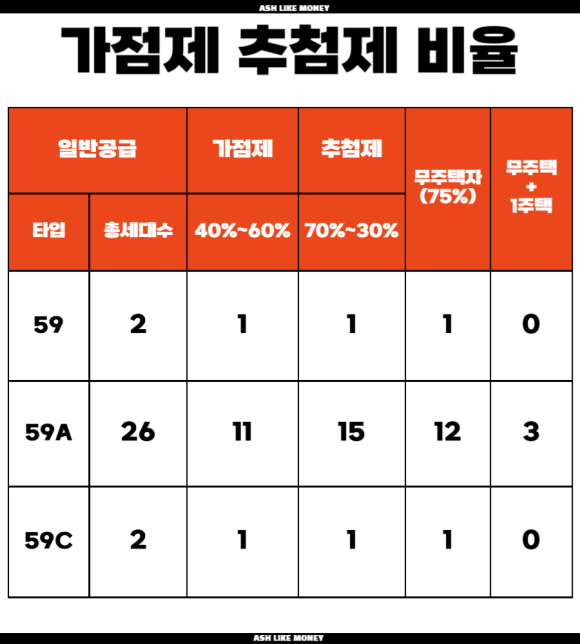 투기과열지구이기에 가점제 및 추첨제 방식이 적용되는데, 59A타입의 경우 추첨제로 15세대(무주택자 12세대 + 1주택 3세대)이기에 사실상 매우 당첨되기 어려운 세대수는 확실하다. 규제지역이기에 아크로 드 서초는 세대주 요건이 있어 부부중복청약이 불가능하므로 주의해야 한다. 그러나 특별공급의 경우 세대주 요건이 없는 기관추천, 다자녀가구, 신혼부부는 중복청약이 가능하다. 초 대박 로또청약이기에 가능하다면 중복청약은 필수이다.