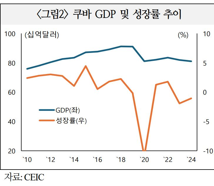 ● 지난 5년간(19 ~24년) 쿠바의 GDP는 11.0% 감소하고 수출액은 62% 축소. 정부의 25년 공식 인플레이션은 14%이나, 실제로는 70%에 달할 소지