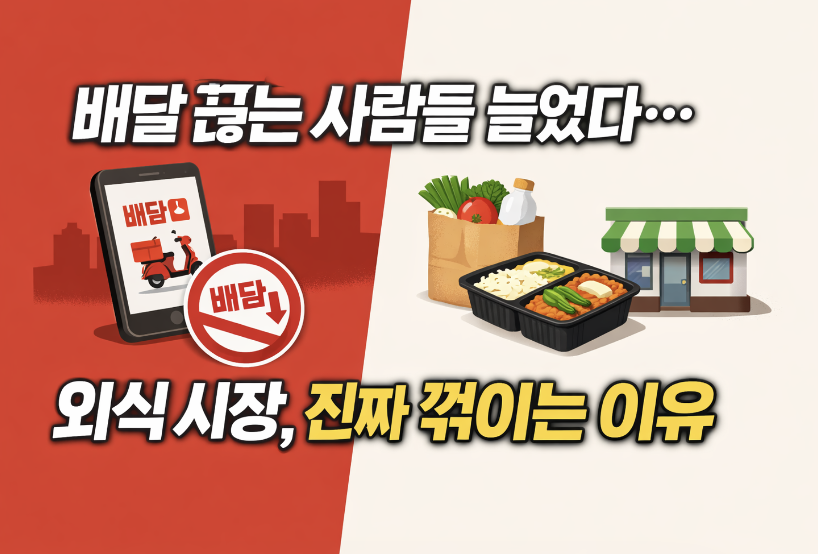 요즘 주변을 보면 자연스럽게 이런 얘기가 나오기 시작했습니다. 예전에는 아무 생각 없이 배달앱을 켜고 주문을 했는데, 이제는 한 번 더 고민하게 된다는 겁니다. 단순히 개인의 소비 습관이 바뀐 걸까요. 저는 그렇게 보지 않습니다. 지금 한국 외식·배달 시장에서는 굉장히 중요한 구조적인 변화가 시작되고 있다고 생각합니다. 이건 단순히 배달을 덜 시키는 문제가 아니라, 사람들이 ‘돈을 쓰는 방식 자체’를 바꾸고 있는 흐름입니다.