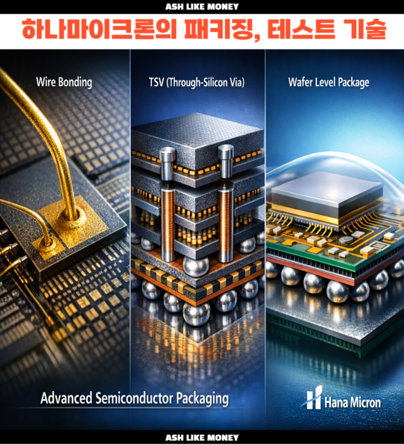 하나마이크론은 반도체를 패키징하고 테스트하는 회사(후공정)으로 세계 9위, 국내 1위까지 갔다. 패키징은 반도체 칩을 보호, 전기를 연결하고 PCB에 붙일 수 있게 만드는 작업이다. 테스트는 정상 작동 여부 검사, 불량 선별하는 작업이다. 이 2개를 동시에 하는 회사가 바로 반도체 후공정이다. 삼성전자나 SK하이닉스가 아무리 좋은 칩을 만들어도 패키징을 못 하면 제품 사용을 할 수 없다. 특히, 최근에는 고성능 + 고집적 패키징 기술이 중요해짐에 따라 하나마이크론이 주목받고 있다.