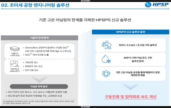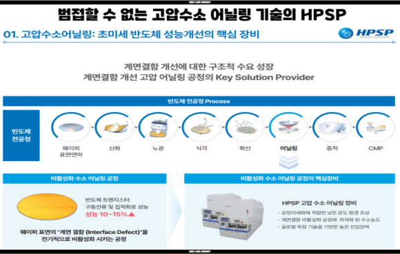 HPSP는 세계 최초로 고압 수소 어닐링 장비를 상용화한 기업이다. 고압 수소 어닐링은 반도체 공정에서 생긴 결함을 제거하고 전류 흐름을 더 좋게 만들어 성능을 향상시킨다. 그래서 미세공정에서 필수적이고 HPSP의 핵심 기술이다. 하이 케이 메탈 게이트 HKMG공정에서 하이 케이로 인한 웨이퍼 표면 계면 결함을 전기적으로 비활성화시켜 트랜지스터 구동 전류 및 집적회로 성능을 15% 개선시킨다.
