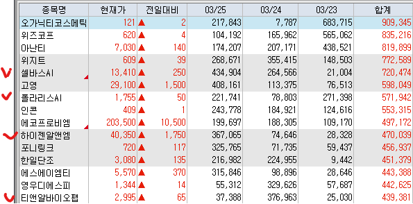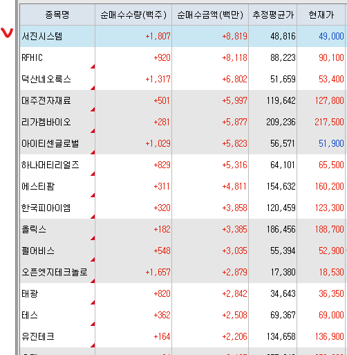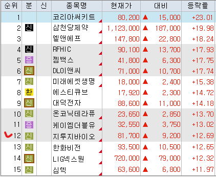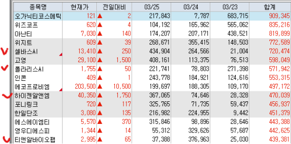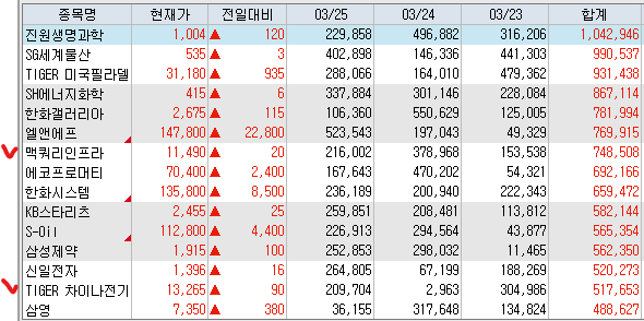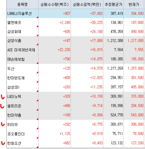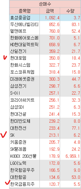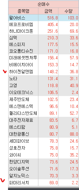 매도 : 포스코퓨처엠 현대차 GS건설 삼성SDI 코리아서키트(+41.05%) 대한광통신 케이엠더블유(+50.46%) 아비코전자 우리로(+138.28%) 쏠리드(+75.88%) LG화학 한전기술 이노와이어리스(+62.24%) LIG넥스원 제주반도체 유진테크 로보티즈 하나머티리얼즈 알테오젠 에코프로비엠 크래프톤 Tiger2차전지테마 솔루스첨단소재 디앤디파마텍 LG에너지솔루션 퀄리타스반도체
