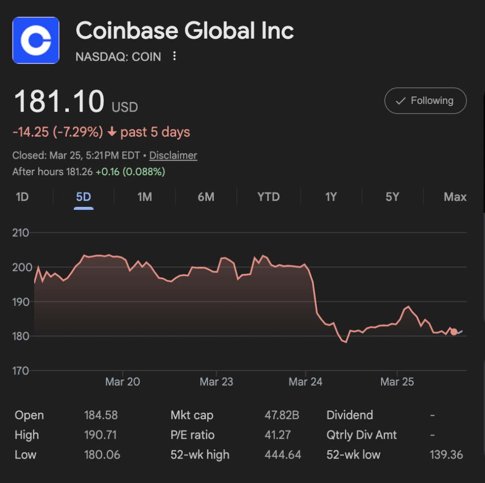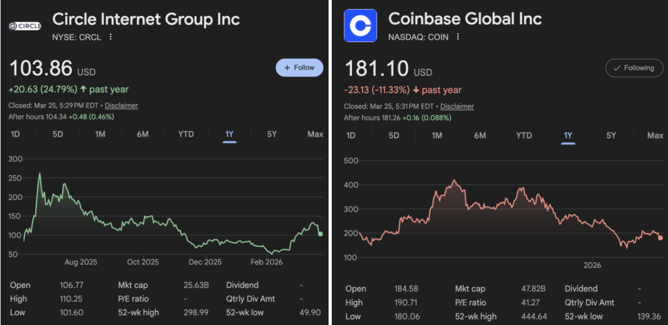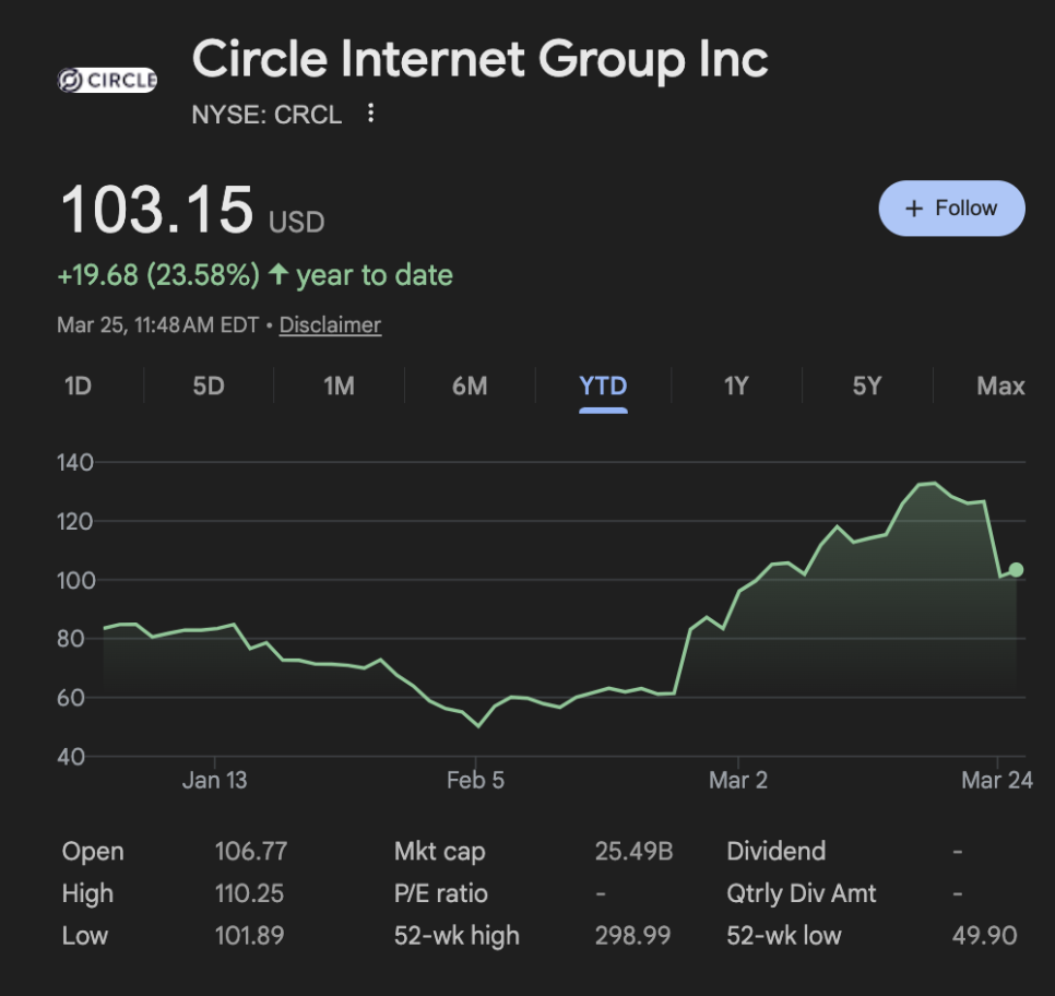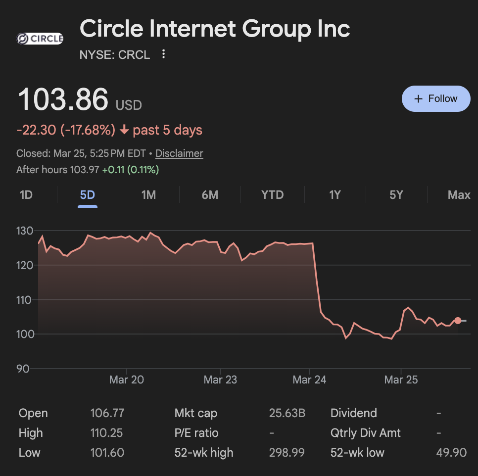 화요일, 서클의 주가가 약 20% 폭락하면서 한때 100달러 선 아래로 내려갔다가 현재는 100달러 위에서 안정을 찾았습니다. 같은 날 코인베이스(Coinbase) 주가도 약 10% 하락했습니다.