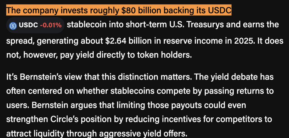 서클이 실제로 돈을 버는 방식을 보면 이 차이가 더 분명해집니다. 서클은 USDC를 뒷받침하는 약 800억 달러 규모의 자산을 단기 미국 국채에 투자해서 그 이자 수익을 가져갑니다. 2025년 한 해 동안 이 방식으로 약 26억 4천만 달러의 수익을 올렸습니다. 그런데 서클은 이 수익을 USDC 보유자에게 직접 지급하지 않습니다. 즉, 법안이 문제 삼는 "이자 지급" 구조와는 다르다는 것이죠.