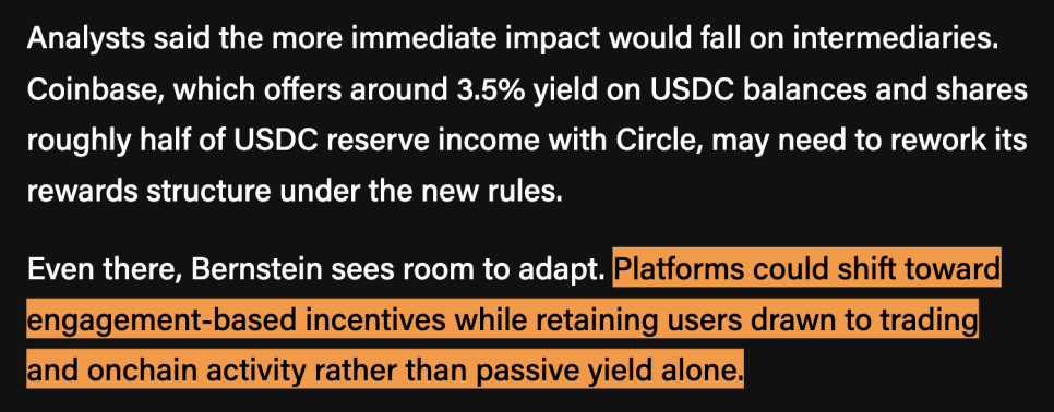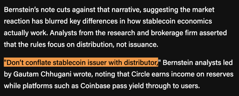 핵심은 이렇습니다. 법안이 규제하려는 대상은 스테이블코인 발행사(issuer)가 아니라 유통사(distributor), 즉 중간에서 수익을 사용자에게 전달하는 플랫폼이라는 겁니다. 버스타인의 수석 애널리스트 고탐 추가니(Gautam Chhugani)는 "스테이블코인 발행사와 유통사를 혼동하지 말라"고 명확히 선을 그었습니다.