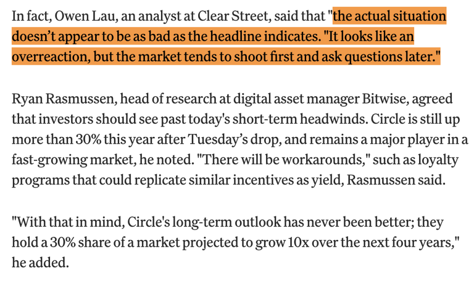 클리어 스트리트(Clear Street)의 오언 라우(Owen Lau)는 "실제 상황이 헤드라인만큼 나쁘지 않다"며 "시장이 일단 팔고 나중에 생각하는 패턴"이라고 말했습니다. 디지털 자산 운용사 비트와이즈(Bitwise)의 리서치 헤드 라이언 라스무센(Ryan Rasmussen)은 "로열티 프로그램처럼 이자를 대체할 방법들이 생겨날 것"이라며 과도한 비관론을 경계했습니다. 그는 "서클은 현재 향후 4년간 10배 성장이 전망되는 시장의 30%를 점유하고 있다"고도 덧붙였습니다.