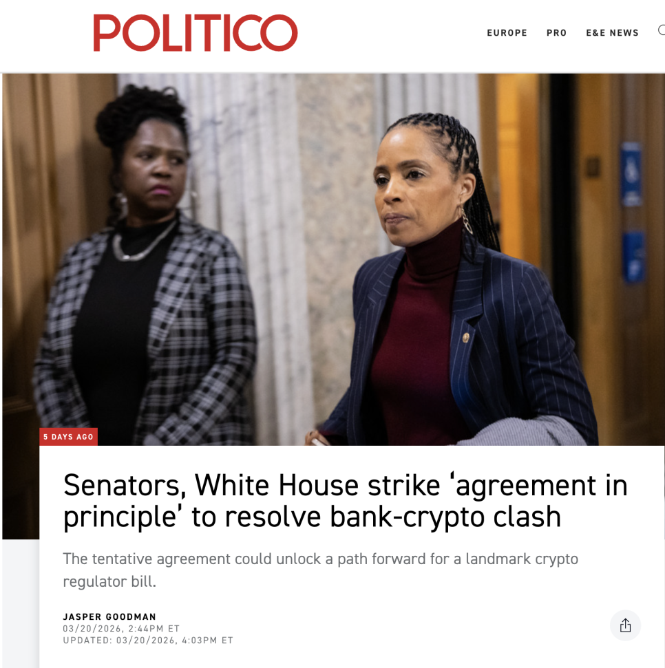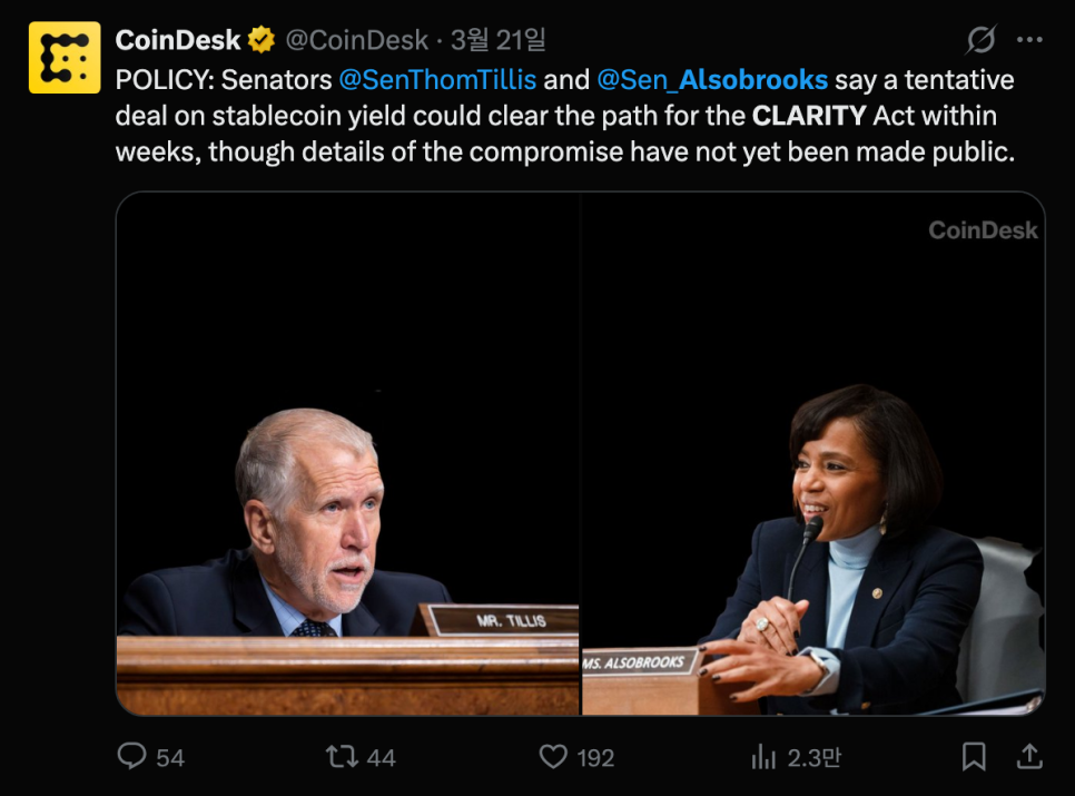 현재 상황은 이렇습니다. 지난주에 상원의원 톰 틸리스(Thom Tillis)와 안젤라 알소브룩스(Angela Alsobrooks)가 백악관의 지지 속에 스테이블코인 이자 문제에 대한 합의안을 도출했고, 4월 중순 상임위원회 심의를 목표로 논의가 이어지고 있습니다. 그런데 이번 초안 텍스트를 두고 은행 업계 쪽에서는 "우리 입장이 많이 반영됐다"는 긍정적 반응이 나오는 반면, 크립토 업계에서는 "너무 제한적"이라는 불만의 목소리가 나오고 있습니다.