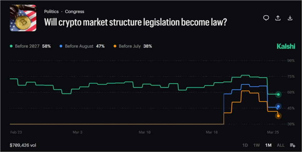 한편 법안 자체의 앞날도 불투명해졌습니다. 예측 시장 폴리마켓(Polymarket)에서 클래리티 법안이 2026년 내에 서명될 확률은 67%에서 62%로 내려앉았고, 칼시(Kalshi)에서는 8월 이전에 법이 될 확률이 66.6%에서 46.2%로 무려 20%포인트 가까이 뚝 떨어졌습니다.