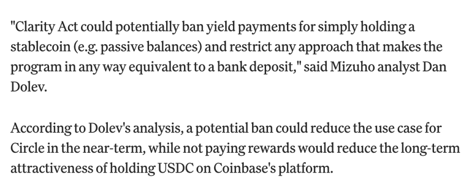 미즈호(Mizuho)의 애널리스트 댄 돌레브(Dan Dolev)는 이 조항이 시행될 경우 단기적으로는 서클의 활용 사례가 줄어들고, 장기적으로는 코인베이스 플랫폼에서 USDC를 보유하려는 유인도 약해질 수 있다고 지적했습니다. 디지털 자산 리서치 업체 키록(Keyrock)의 아미르 하지안(Amir Hajian)도 "지금까지 스테이블코인 채택을 이끌어온 수익 모델의 기반을 통째로 흔드는 것"이라고 말했습니다.