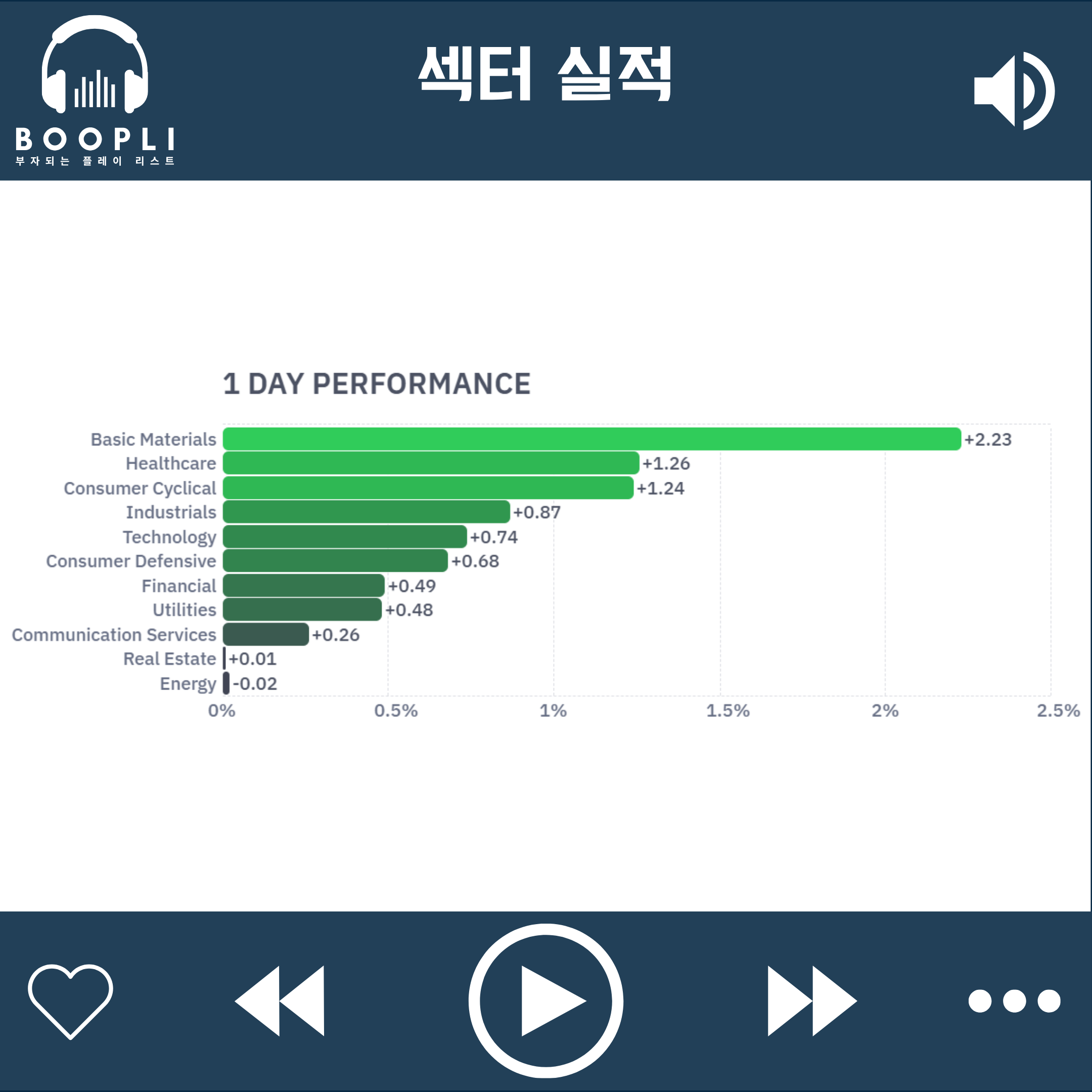국채 금리 하락으로 원자재 섹터가 상승을 주도, 이어서 헬스케어, 소비 순환재, 산업재, 기술, 경기 방어주 순으로 강세