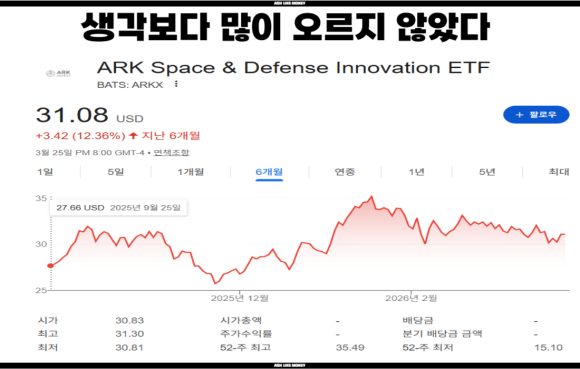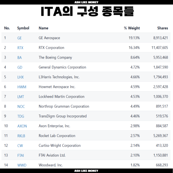 ITA는 UFO처럼 순수 우주 항공 관련 ETF는 아니고 미국 방산 + 항공 ETF이다. 대부분 미국 방산회사들이 포함되어 있는데 록히드마틴, 보잉, 노스롭 그루만, RTX 같은 종목들이다. 전투기, 미사일, 군수산업, 항공기 같은 실제 전쟁에 쓰이는 무기들이 만들어지는 만큼 현재 이란과 미국 전쟁에 가장 수혜를 많이 보는 ETF라고 할 수 있다. 하지만 방산주 자체가 안정적인 사업이라 주식이 묵직하여 크게 움직이지는 않았다.