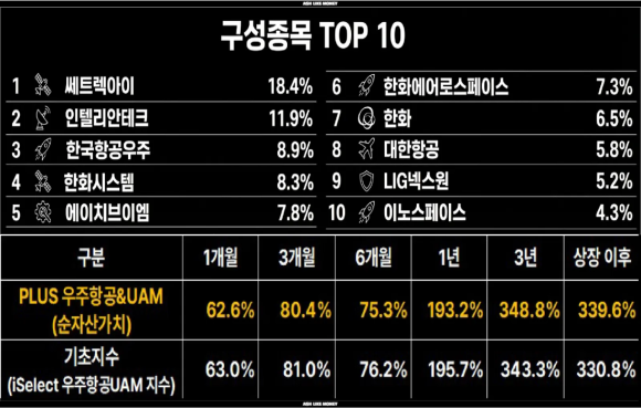 한국의 대표적인 우주항공 관련 ETF는 PLUS 우주항공&UAM ETF이다. 운용사는 한화자산운용이고 위성, 방산, UAM(도심항공모빌리티)를 포함한다. 운용하는 기업의 내용으로는 한국 기업인 쎄트렉아이, 한화시스템, LIG넥스원, 한화에어로스페이스 같은 방산 회사와 한국항공우주, 대한항공, AP위성, 이노스페이스 등의 우주, 항공 관련주들을 포함한다. 현재 국내에서 가장 제대로 된 우주 항공 ETF라고 평가받고 있다.