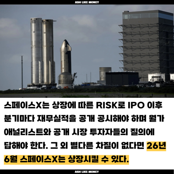 스페이스X의 IPO 신청이 3월 말에 끝났다. 규제 당국에 투자설명서를 제출하는데 스페이스X는 이번 상장을 통해 750억 달러, 우리 돈으로 110조원 이상을 확보할 계획이다. 이는 사우디 아람코보다 훨씬 큰 금액으로 사람들이 머스크의 계획에 공감하고 동참하고 있다는 뜻으로도 들린다. 스페이스X의 기업가치는 xAI까지 인수하여 1조 2,500억 달러까지 상승한 만큼 상장과 동시에 엄청난 폭등이 예상되는 바이다. 하지만 규제당국 규정상 1년 가량의 대기 기간을 거쳐야 지수에 편입되지만, 머스크는 이미 엄청 몸값이기에 미리 지수에 편입시켜달라고 문을 두드리는 중이다.