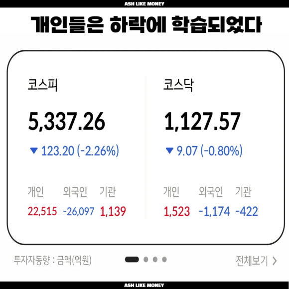 메모리 반도체 대장주인 SK하이닉스와 삼성전자는 어제 미국이 급락한 것에 비해 잘 버티고 있다. 개인들이 엄청난 매수를 한 덕에 외국인들이 팔고 있음에도 불구하고 주가는 하락에서 상승압박을 받고 있다. 이미 국내주식을 하는 사람들에게는 한번 하락이 있으면 그 다음날 상승한다고 믿고 하락에 사서 상승에 파는 일을 반복하고 있다. 그리고 실제로 국장에선 하루 건너 하락, 하루 건너 상승을 반복하고 있어 단타로 접근하는 사람들이 많아졌다.
