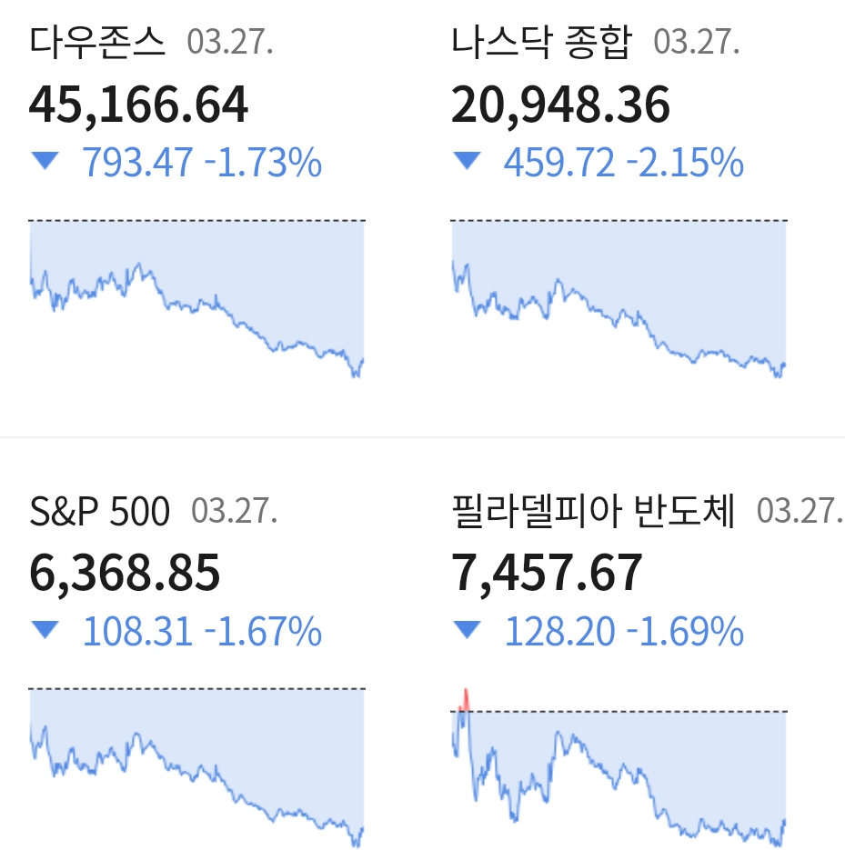 다우지수는 전일 대비 -1.73% 하락한 45,166.64에 거래를 마쳤으며, 대형주 중심의 S&P500 지수는 전장 대비 -1.67% 떨어진 6,368.85에 장을 마감하였습니다. 기술주 중심의 나스닥 지수는 전 거래일 대비 -2.15% 떨어진 20,948.36에 거래를 마치며 장을 마감하였습니다.