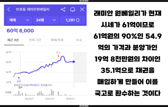 예를들어, 래미안 원베일리가 60억이면 90%인 54억과 분양가 20억의 차이인 34억을 채권으로 매입하는 것이다. 정부에서는 이 채권을 통해 주택도시기금, 복지자금 등으로 사용하여 재원을 걷어들이는 것이다. 이전에 채권입찰제에 사용되었던 20년 만기 국민주택2종채권의 경우 채권할인율이 29% 정도이기에 채권입찰제가 실행된다면 분양이익의 큰 부분을 정부가 회수하는 것이다.
