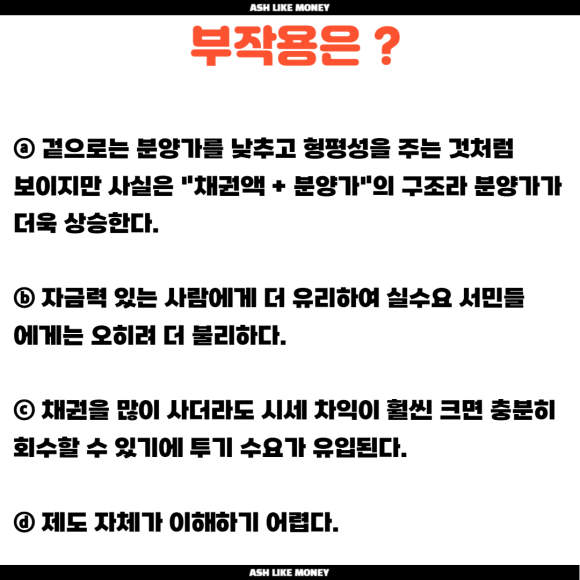 그러나 채권을 살수록 분양가는 더 상승하는 것이다. 실질적으로 부담하는 금액이 "분양가 + 채권매입비용"이기에 추가 분양가 상승이란 부작용을 가진다. 채권 가격이 입찰 경쟁으로 높아지면서 채권 시장이 비정상적으로 움직이고 민간에서는 채권액과 분양가를 합친 가격이 시세에 육박하면서 대규모 미분양이 많이 발생하는 단점도 있다. 그리고 채권을 많이 살수록 당첨 확률이 높아지기에 현금이 많은 사람들에게 유리하고 실수요자인 서민들은 불리해진다.