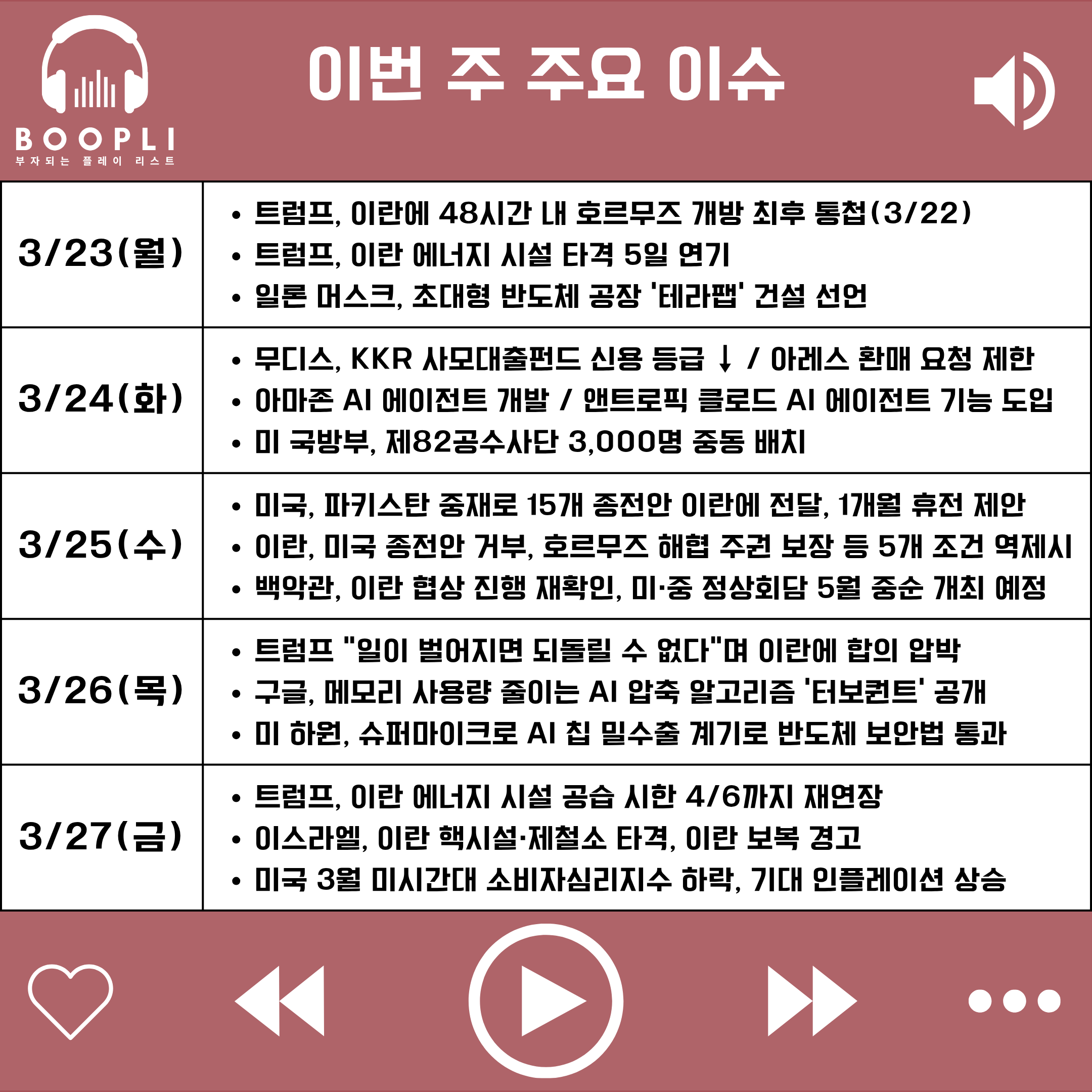 주 초반에는 트럼프 대통령이 이란과의 협상 진전을 언급하며 군사 타격을 5일간 유예한다고 선언하자 '트럼프는 항상 물러선다'는 'TACO(Trump Always Chickens Out)' 트레이드가 작동하며 유가·금리가 급락하고 주요 지수가 일제히 상승했으나, 이란 측의 협상 사실 전면 부인과 이스라엘의 테헤란 공습 강행으로 상승폭이 일부 반납됐다.