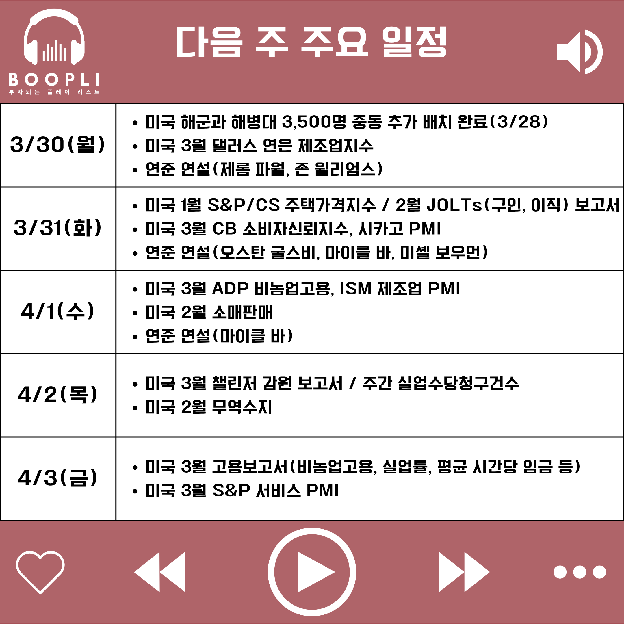 다음 주 미국 증시는 중동 전쟁의 불확실성이 해소되지 않은 상태에서 고용지표와 연준 인사들의 발언이라는 거시경제적 변수들이 맞물리며, 국채 금리의 변동성에 따라 지수의 방향성이 결정되는 변동성 장세를 이어갈 것으로 보인다.