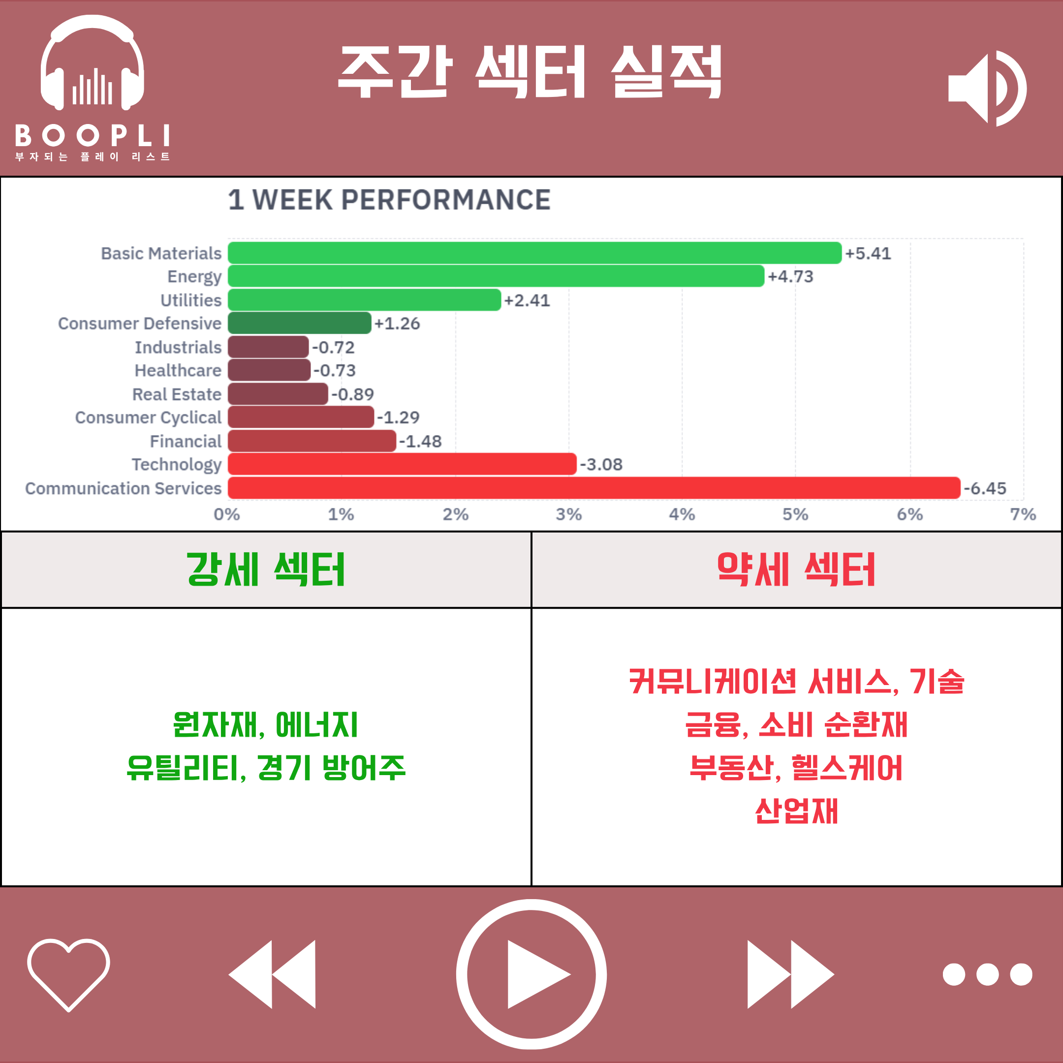 이번 주에는 중동 전쟁이 이어지는 가운데 원자재 섹터가 상승을 주도했고 이어서 에너지, 유틸리티, 경기 방어주 순으로 강세를 보였다.