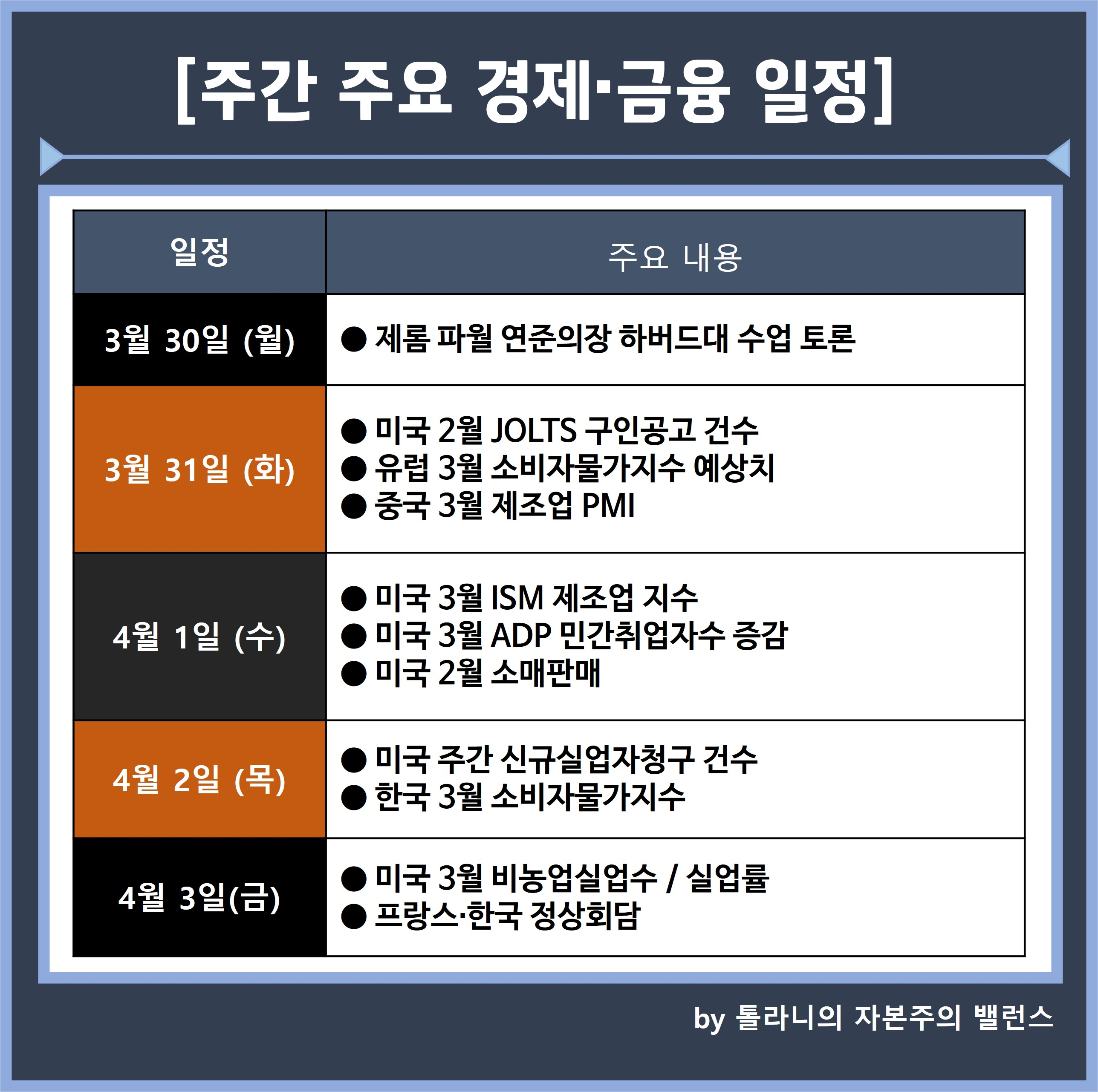 3) 중국 3월 PMI 발표. 마크롱 대통령은 한국과 일본 방문