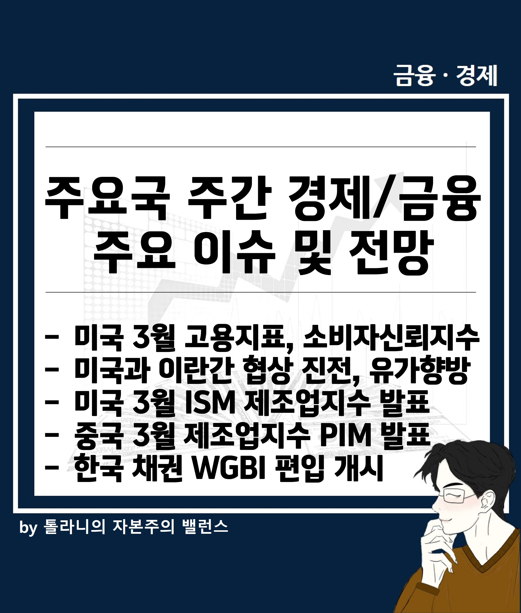 이에 '미국 3월 고용지표, 소비자신뢰지수 발표 등 증시 일정 및 주요 국가 경제·금융 이슈' 관련하여 언론 보도 및 국제금융센터 보고서를 통해 좀 더 자세히 알아보도록 하겠습니다.