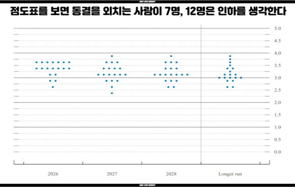 전쟁으로 유가가 상승하고 그에 따른 모든 에너지 가격이 상승하였다. 물류 차질, 해외 운임료도 증가하고 그에 따라 기업 원가를 전부 소비자 가격에 전가하였다. 미국도 금리인하를 미루고 상황을 지켜보기로 했다. 26년 3월 나온 FOMC 점도표를 보면 26년 최종 금리 수준을 7명은 3.75%로 쭉 동결, 또 다른 7명은 3.5%로 0.25% 추가 하락을 생각하고 있다. 현재 매파적 분위기의 투표권자는 파월을 비롯한 총 12명의 지역 연방은행 총재들과 FED 의원이다.