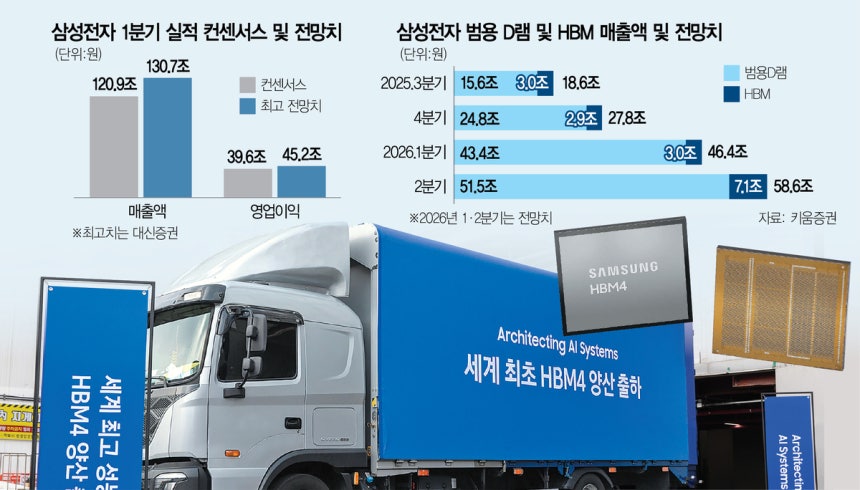 금융투자 업계에서는 D램과 HBM4 매출이 본격 증가하는 2분기 삼성전자의 영업이익이 50조 원, 3분기에는 60조 원을 넘어설 것으로 예측하고 있음