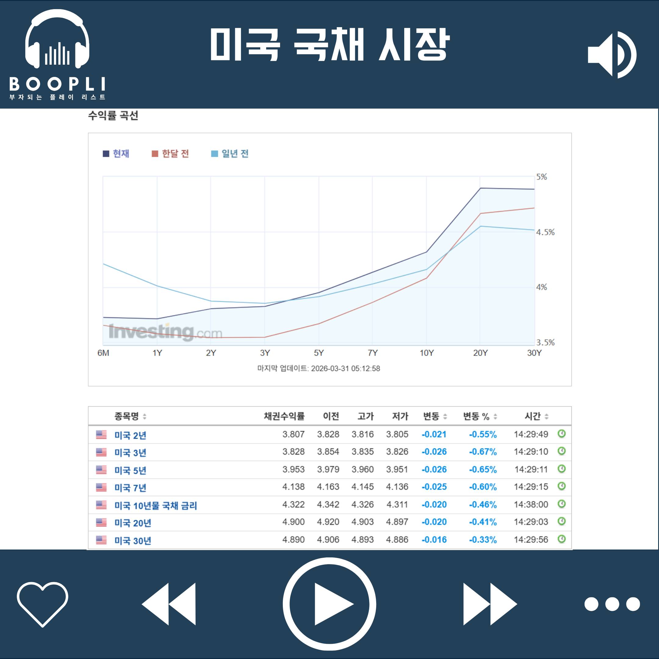 미국 국채는 중동 전쟁으로 국제 유가 상승세가 지속되었으나, 인플레이션 우려가 경기 둔화 가능성으로 전환된 가운데 파월 연준 의장이 금리 인상 가능성을 약화시키자 장단기 금리 모두 하락