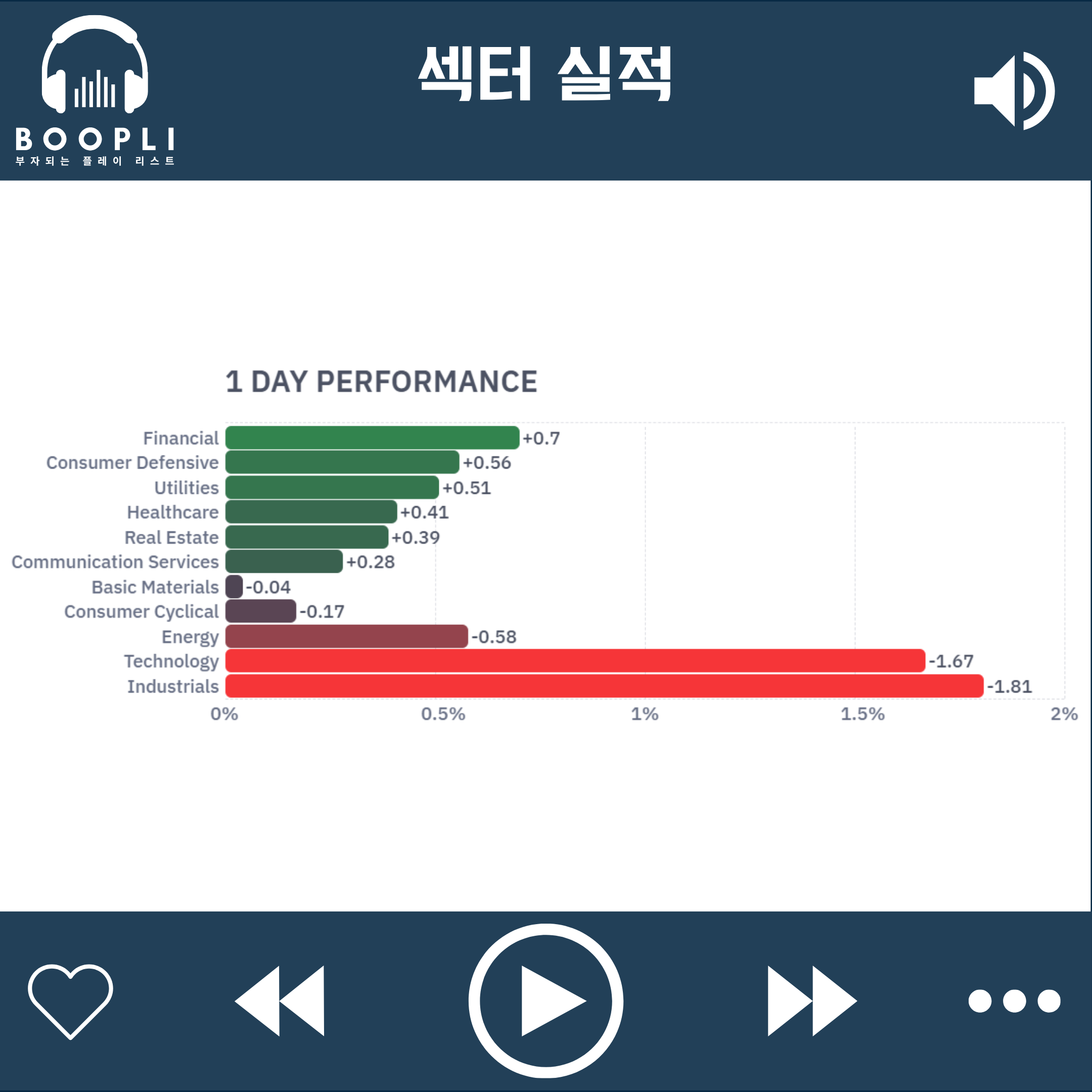 방산과 반도체 업종 부진으로 산업재, 기술 섹터가 하락 주도, 이어서 에너지 섹터도 약세