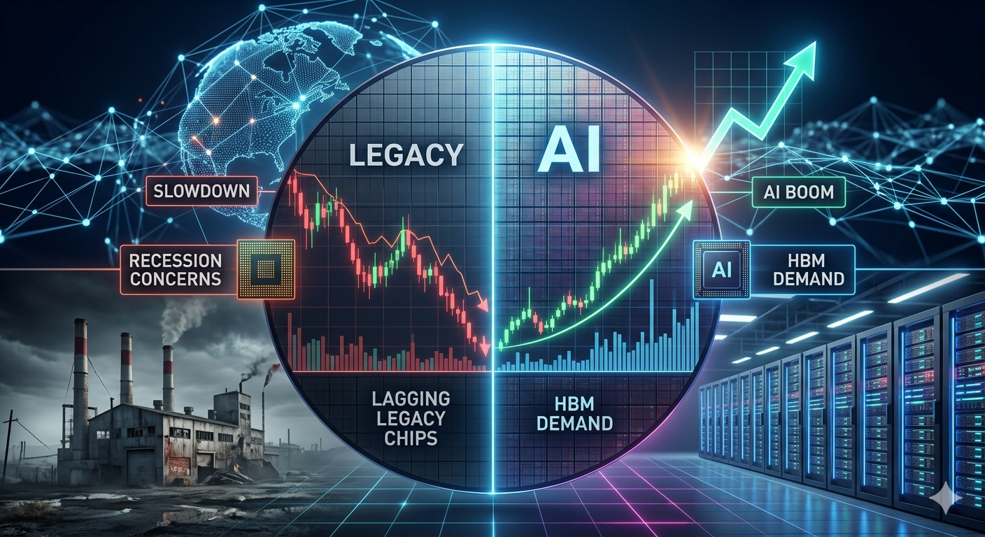 현재 시장은 AI(인공지능) 구동에 필수적인 고대역폭메모리(HBM) 등 특정 첨단 분야와, 스마트폰이나 PC 등에 들어가는 전통적인 범용(레거시) 메모리 분야로 철저하게 나뉘어 있습니다. 글로벌 빅테크 중심의 AI 관련 수요는 폭발적으로 늘어나고 있지만, 글로벌 경기 둔화 우려로 인해 일반 소비자의 IT 기기 수요가 위축되면서 범용 제품의 회복 속도가 시장의 기대치에 크게 미치지 못하고 있습니다.