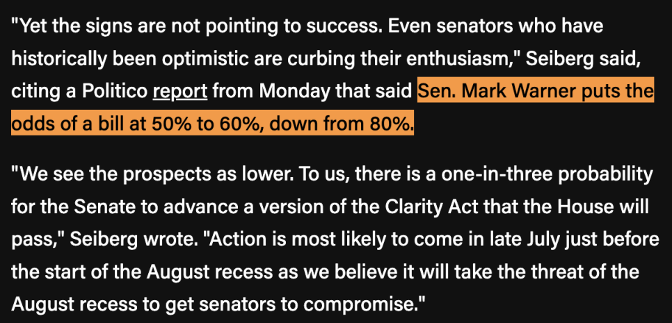 마지막으로 미국의 암호화폐 규제 얘기입니다. 미국 시장구조 법안인 클래리티 액트(CLARITY Act)는 여전히 상원에서 발목이 잡혀 있습니다. 투자은행 TD 카운(TD Cowen)은 이 법안이 올해 통과될 확률을 3분의 1, 즉 약 33%로 보고 있다고 밝혔습니다. 마크 워너(Mark Warner) 상원의원도 기존에 80%로 봤던 통과 가능성을 50~60%로 낮춰 잡았다는 보도가 나왔습니다.