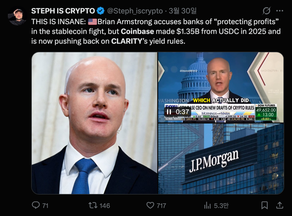 최근 협상의 초점은 스테이블코인 이자 지급 문제입니다. 틸리스(Thom Tillis)와 알소브룩스(Angela Alsobrooks) 상원의원이 제안한 타협안은, 스테이블코인을 그냥 보유하고 있을 때는 이자를 줄 수 없지만 실제로 결제 등에 활용할 때는 보상을 줄 수 있다는 내용인데요. 이 안이 코인베이스 같은 플랫폼 입장에서도, 은행 입장에서도 모두 불만스럽다는 게 문제입니다. 코인베이스는 고객 자금을 굴려 수익을 내는 모델을 잃게 되고, 은행들은 스테이블코인이 일상 결제까지 파고들면 예금 기반을 위협받을 수 있다고 우려하고 있습니다.