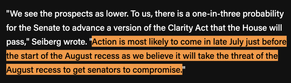 TD 카운의 분석가는 법안이 통과된다면 아마도 8월 의회 휴회 직전인 7월 말이 가장 현실적인 시점이 될 것이라고 내다봤습니다. 결국 마감 압박이 있어야 타협이 이루어질 것이라는 시각이죠.