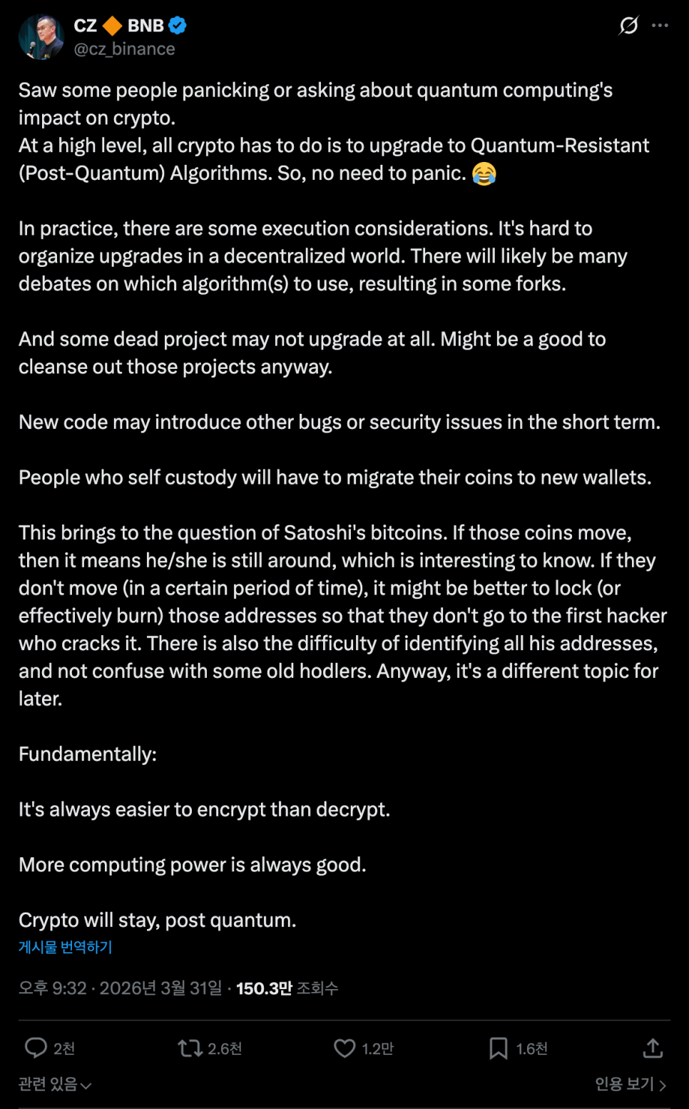 핵심은 비트코인이나 이더리움 같은 탈중앙화 네트워크는 중앙화된 시스템처럼 긴급 업데이트를 빠르게 적용할 수가 없다는 점입니다. 수천수만 명의 개발자, 채굴자, 사용자들이 동의해야 하고, 새로운 암호 표준을 도입하면 네트워크 분열(포크)이나 새로운 보안 취약점이 생길 수도 있습니다. 이 논쟁은 앞으로도 계속될 것 같습니다.