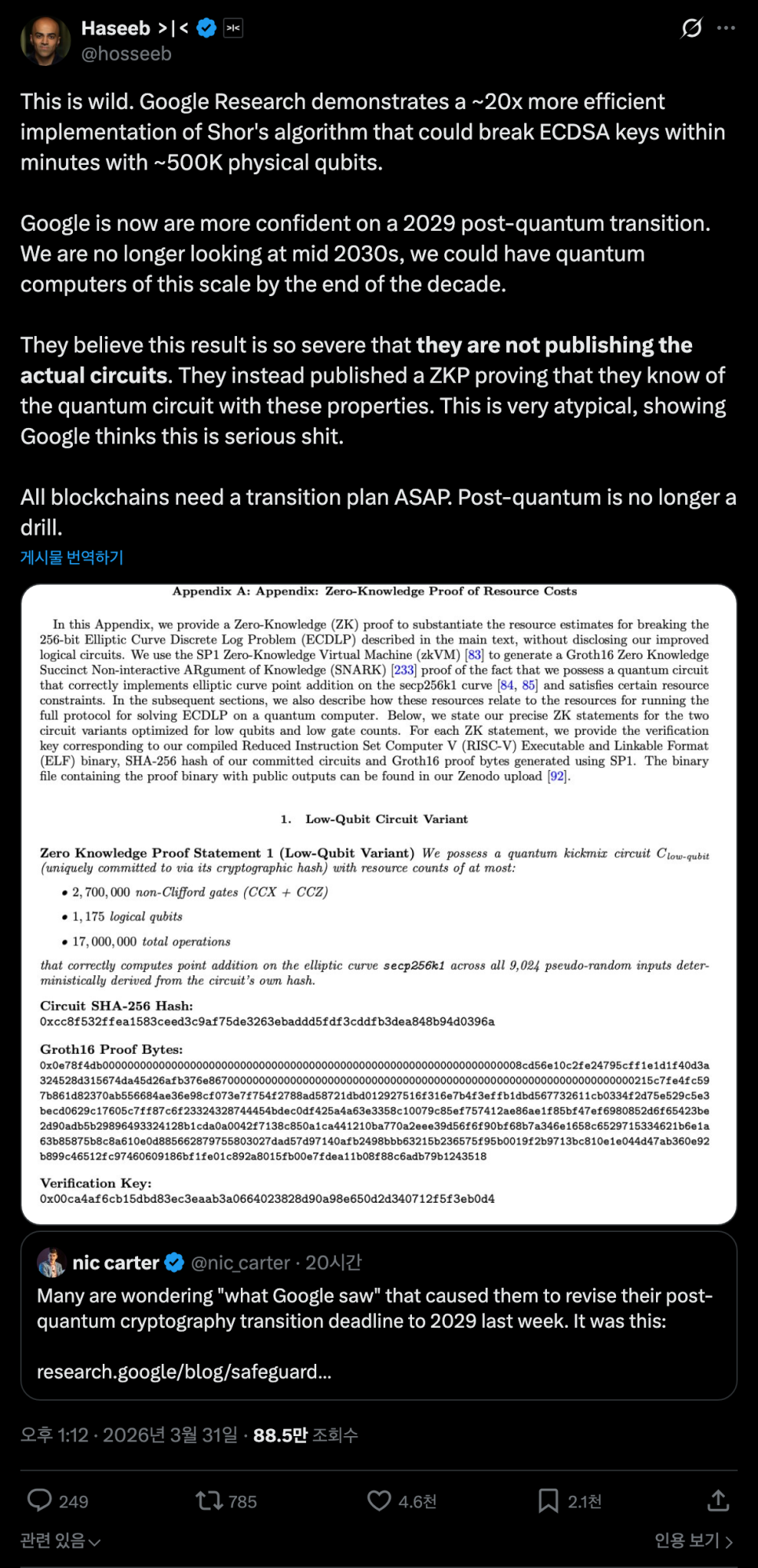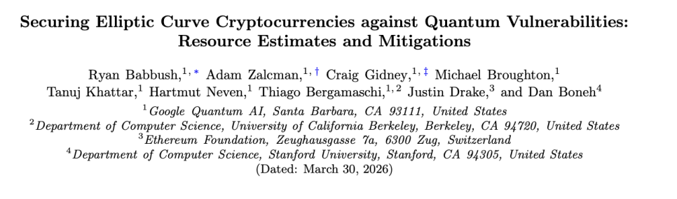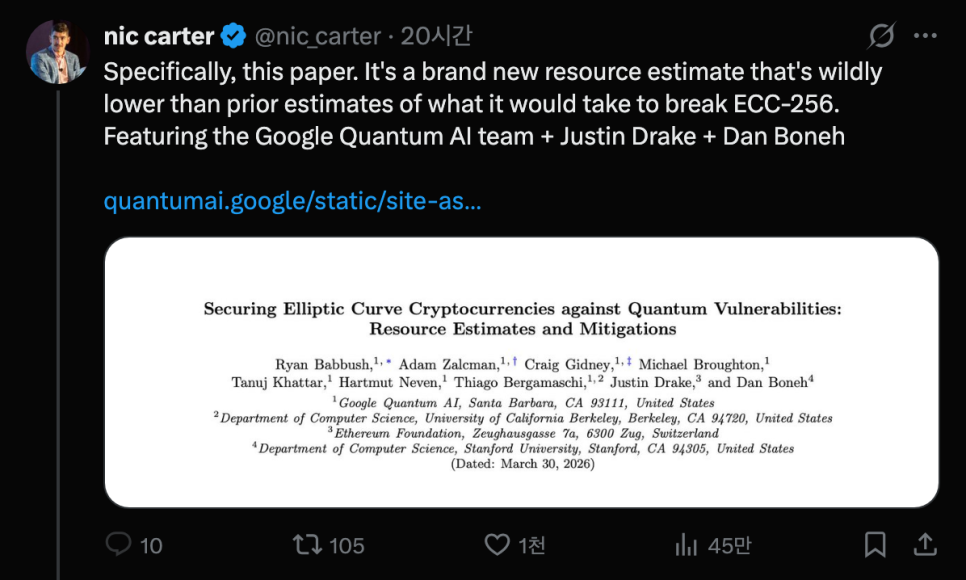 한편 오늘 크립토 업계에서 더 많은 사람들이 주목한 건 사실 구글의 양자컴퓨터 논문이었습니다. 구글 퀀텀 AI 연구팀이 발표한 이번 논문은 '쇼어 알고리즘(Shor's algorithm)'의 훨씬 효율적인 구현 방법을 제시했는데요. 쇼어 알고리즘이란 양자컴퓨터를 이용해 현재 비트코인과 이더리움이 사용하는 암호화 방식, 즉 타원곡선 암호(ECDSA)를 푸는 방법입니다. 쉽게 말하면, 지갑의 개인 키를 깨뜨릴 수 있는 열쇠인 셈이죠.
