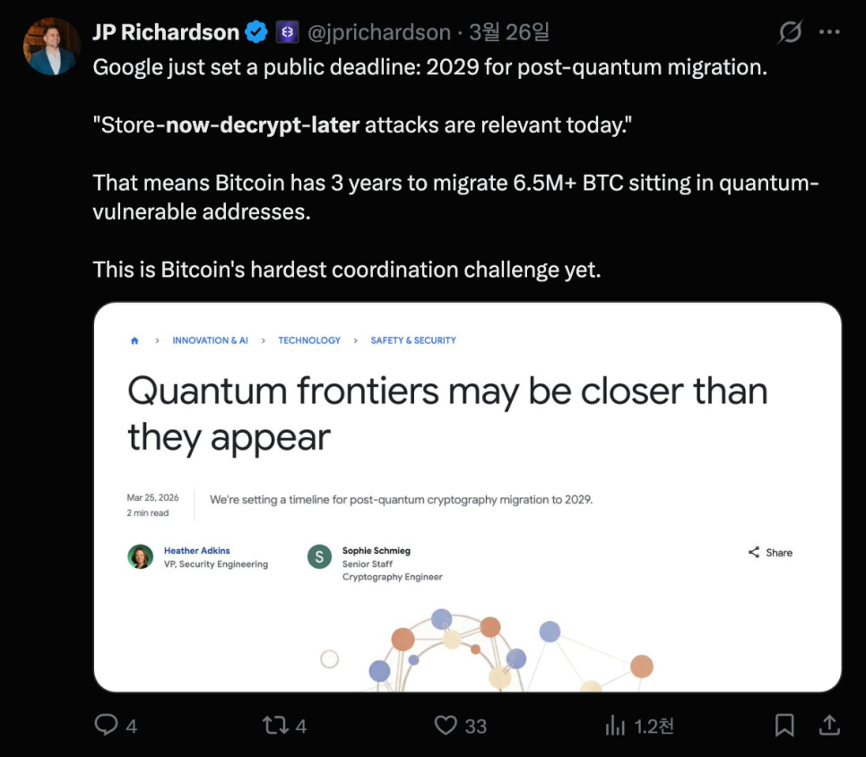 물론 반대 목소리도 있습니다. 바이낸스 창업자 창펑 자오(CZ)는 "크립토가 해야 할 일은 알고리즘을 업그레이드하는 것뿐"이라며 과도한 공포심을 경계했습니다. 이더리움 연구자 저스틴 드레이크(Justin Drake)도 이번 연구의 중요성은 인정하면서도, 실제로 양자컴퓨터가 이 정도 위협이 되는 시점은 아직 확률적인 추정에 불과하고, 2030년대 초에 현실화될 가능성은 여전히 작지만 무시할 수는 없는 수준이라고 평가했습니다.