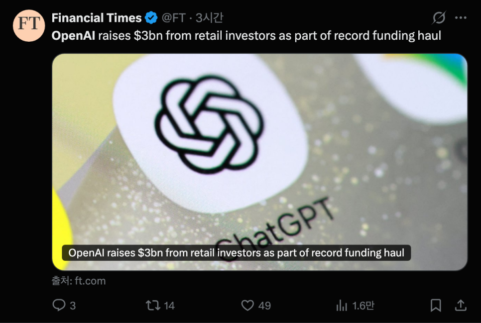 특이한 점은 이번 라운드에서 처음으로 개인 투자자들에게도 은행 채널을 통해 문을 열었다는 겁니다. 30억 달러 규모가 개인 투자자들로부터 들어왔습니다. IPO 전 단계에서 일반 투자자들이 진입할 수 있는 경우는 흔치 않거든요. 그만큼 OpenAI라는 브랜드의 시장 흡인력이 어마어마하다는 걸 보여주는 사례이기도 합니다.