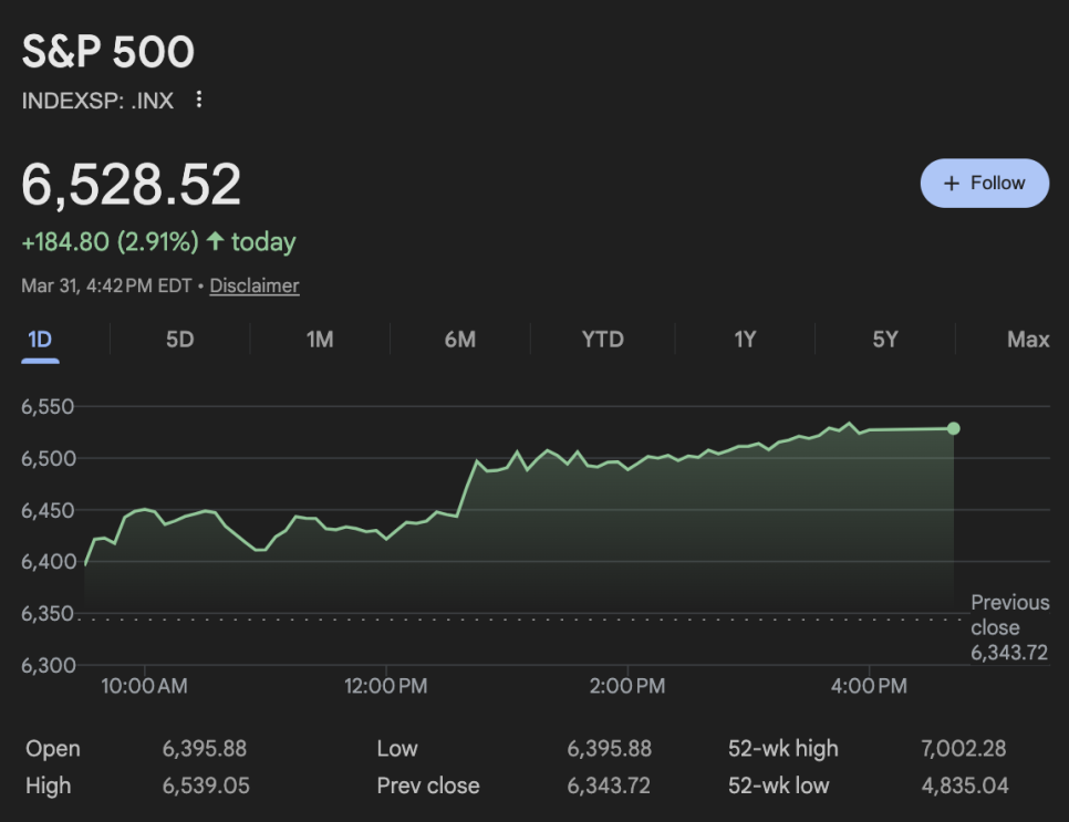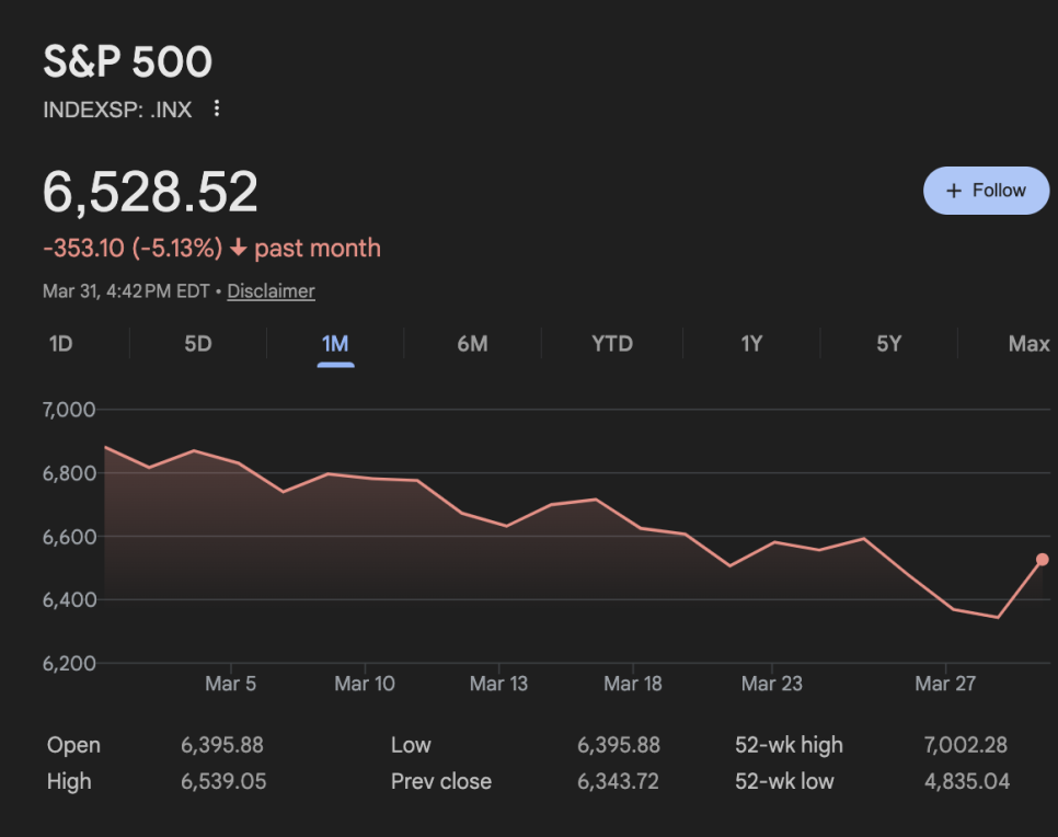 전체적으로는 올랐지만, 한 가지 기억해둘 것이 있습니다. 오늘 반등이 꽤 인상적이긴 했어도, S&P 500은 이번 달 한 달 동안 약 5% 하락한 상태입니다. 오늘이 3월의 마지막 거래일이기도 했는데, 하루 상승만으로 한 달치 손실을 만회하기엔 역부족이었습니다.