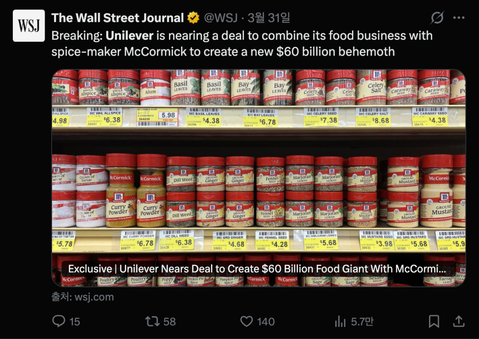 같은 날 맥코믹과 유니레버가 650억 달러 규모의 식품 부문 합병을 발표했습니다. 헬만스 마요네즈, 크노르 수프 같은 브랜드들이 포함된 거래인데요.