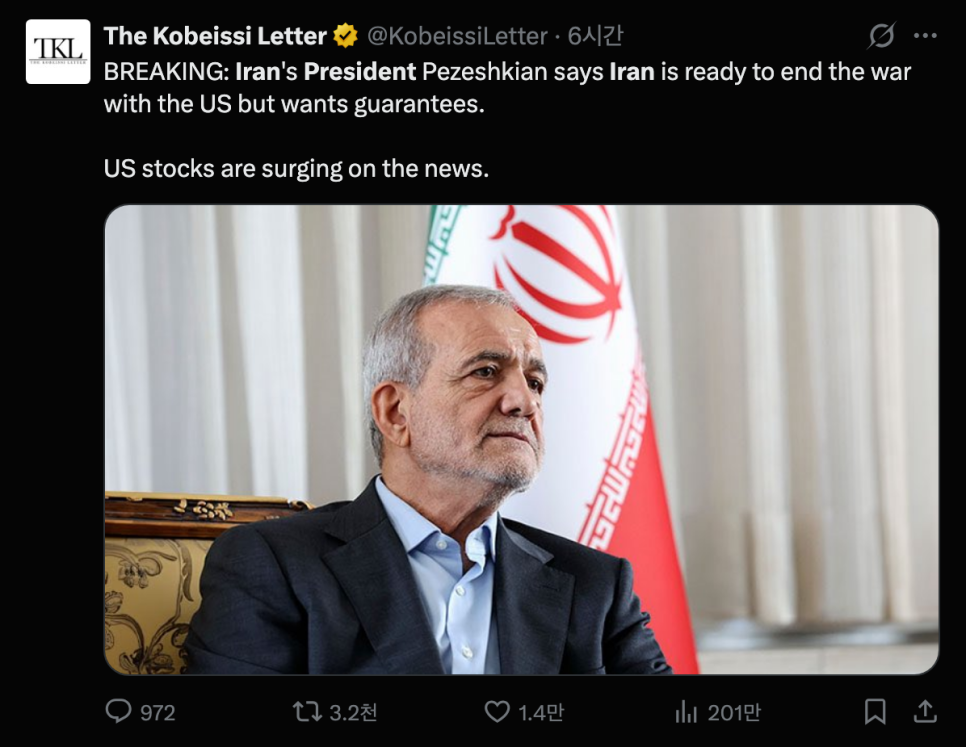 그런데 정오 즈음, 이란 대통령이 "조건이 충족된다면 전쟁을 끝낼 준비가 돼 있다"고 발언하면서 분위기가 완전히 바뀌었습니다. 바로 그 순간부터 거의 모든 섹터가 일제히 올라가기 시작했고요.